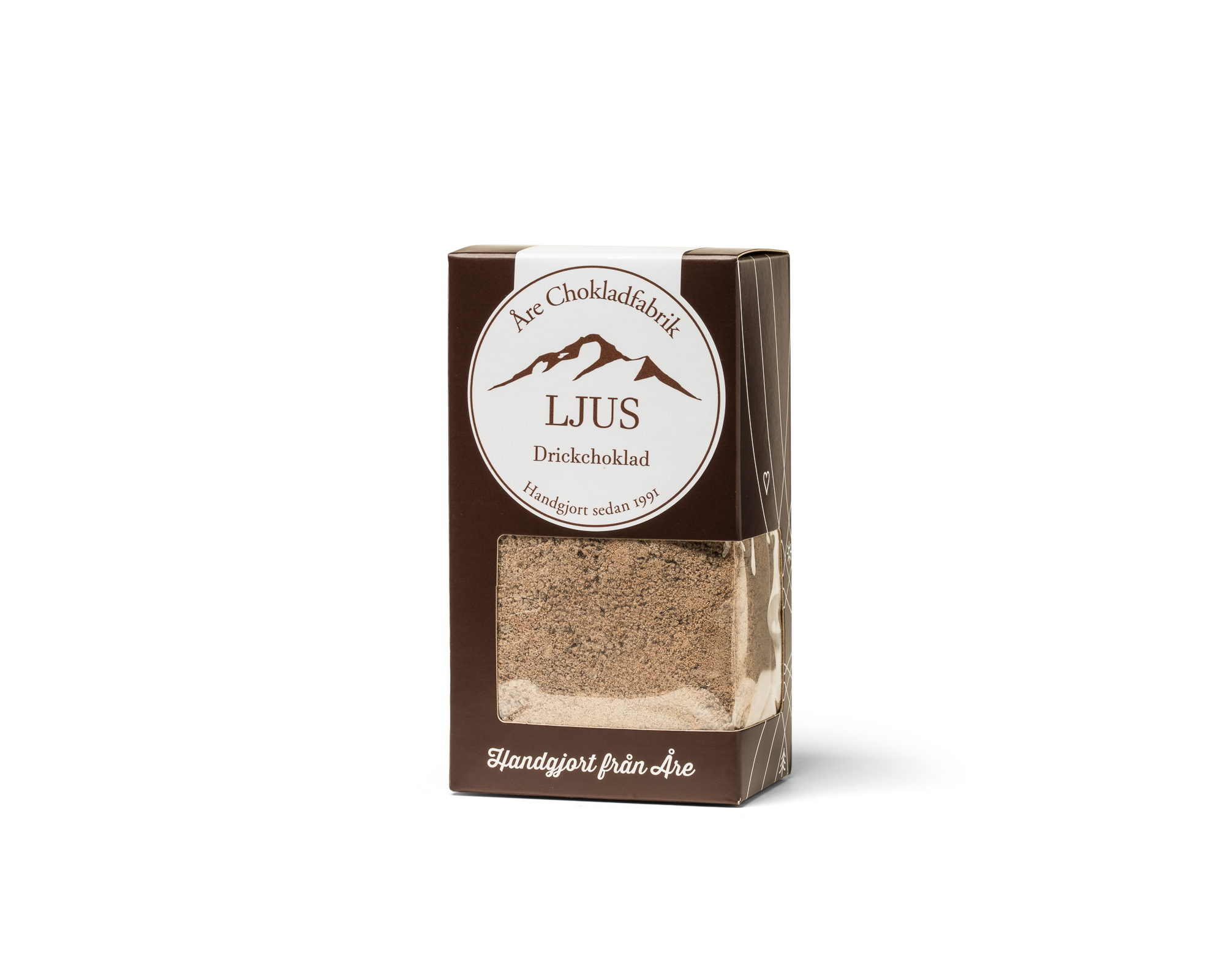 Ny snygg förpackning med utsökt och len ljus drickchoklad. Rör ihop hemma med varm mjölk. Mald och tillredd i vår fabrik i Åre.