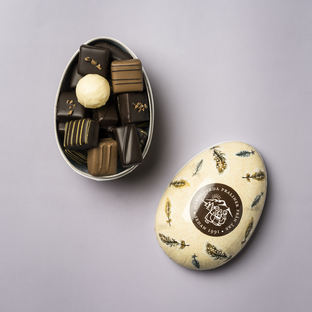 Årets exklusiva påskägg innehåller ett urval av våra bästa smaker. Alla handgjorda och varje pralin har en egen form. Champagnekula, Vaniljpralin, Mörk Pralin(Fleur de Cao) Citronkola, Passionsfruktspralin och vår nyaste marsipan med Amaretto. Då vi har en fransman i köket har vi även lagt till ett kanderat apelsinskal doppad i mörk choklad(écorce d'orange confite).